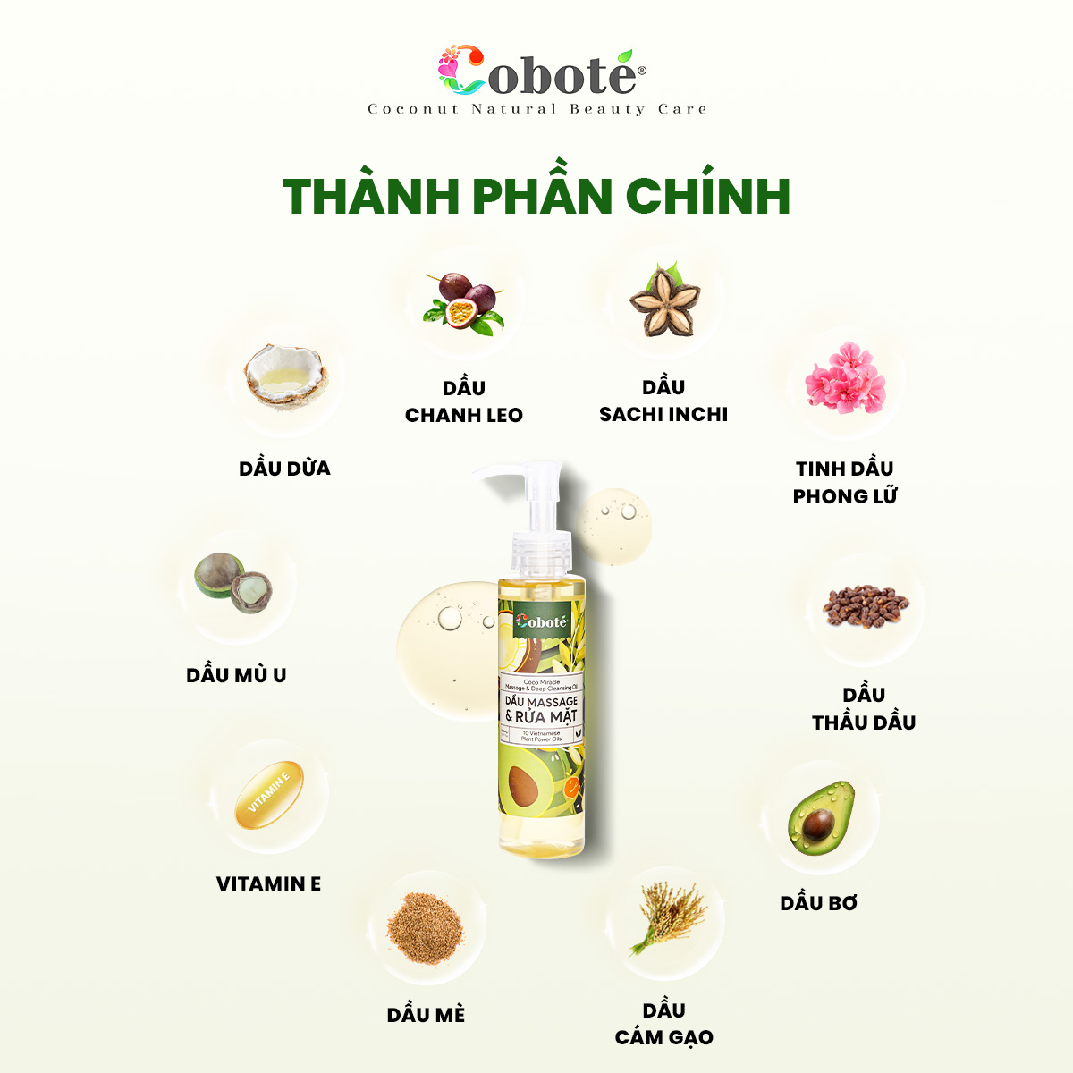 | Thành phần | Cocos Nucifera Oil (Dầu dừa tươi), Oryza Sativa Bran Oil (Dầu cám gạo), Sesamum Indicum Seed Oil (Dầu mè), Sorbeth-30 Tetraoleate, Sorbitan Sesquioleate, Ricinus Communis Seed Oil (Dầu thau dầu), Macadamia Integrifolla Oll (Dầu rắc ca), Persea Gratissima Oil (Dầu tro), Caprylic/Capric Triglyceride (MCT từ dầu dừa), Dầu hạt Calophyllum Inophyllum (Dầu mù u), Dầu hạt Passiflora Incarnata (Dầu chanh leo), Dầu hạt Plukenetia Volubilis (Dầu Sacha Inchi), Dầu hoa Pelargonium Graveolens (Tinh dầu phong lữ), Tocopheryl Acetate (Vitamin E) |